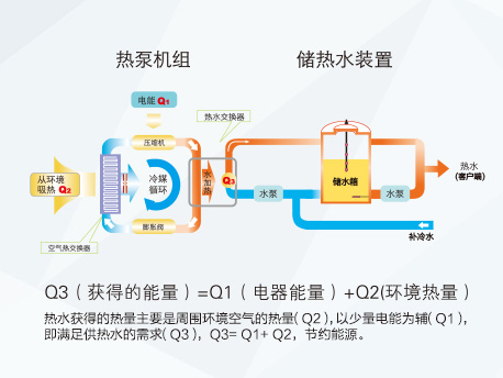 商用空氣能熱水器依據(jù)“逆卡諾”原理工作,以制冷劑為載體,將室外環(huán)境空氣的熱量, 的輸送到水側(cè)換熱器,再將熱量傳遞到水中,供給用戶(hù)以滿(mǎn)足生活熱水的需求。